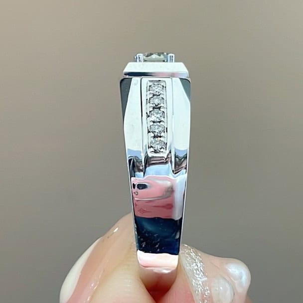 A refined platinum men’s ring featuring a center lab-grown diamond with 10 micro pavé side stones. Designed for subtle brilliance and modern structure.