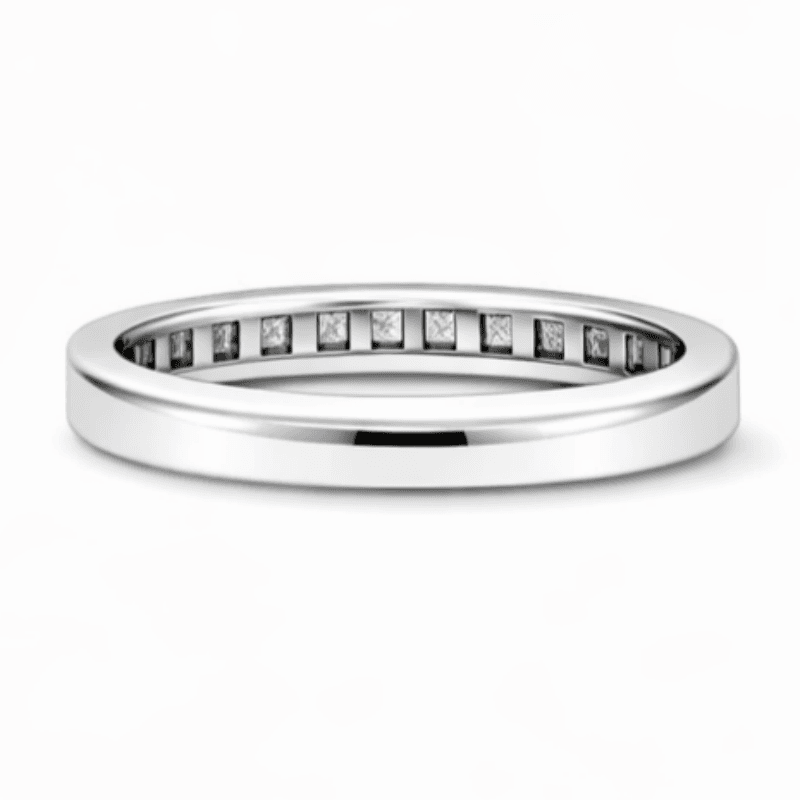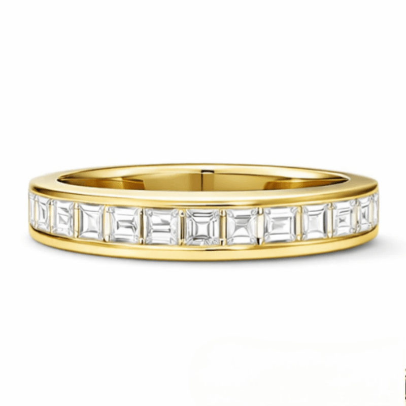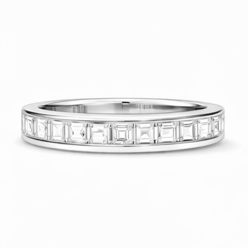 A minimalist eternity ring set with baguette-cut lab diamonds (~0.08ct each), offering a clean, structured look with subtle brilliance.