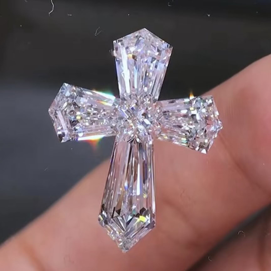 Each piece is cut from a single lab-grown diamond rough and transformed into a unique cross silhouette through advanced custom cutting techniques.