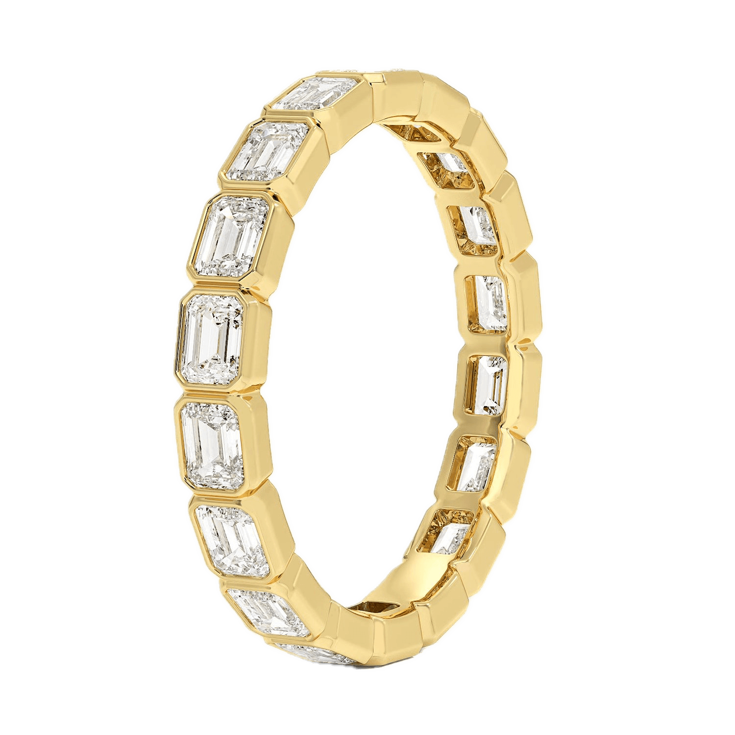 This Horizontal emerald cut lab-grown diamond eternity band features bezel-set stones for sleek brilliance. The geometric emerald cut showcases crisp fire, while the full-circle design balances luxury and wearability. Perfect for stacking with engagement rings or solo wear—ideal for weddings, anniversaries, or daily elegance. A top pick for stackable lab diamond wedding bands and bezel emerald cut jewelry—conflict-free, durable.