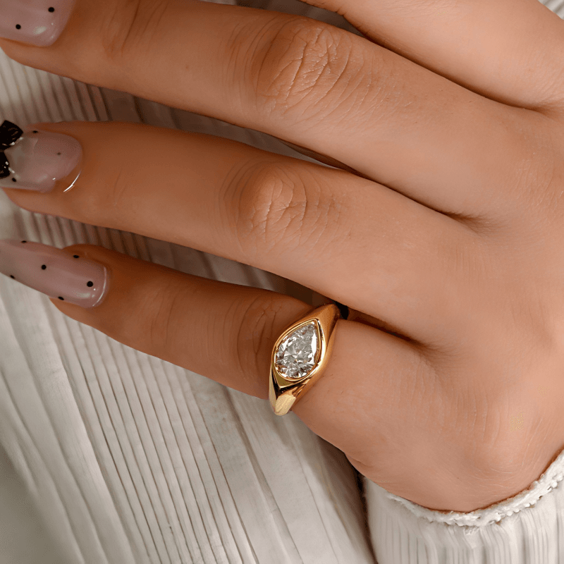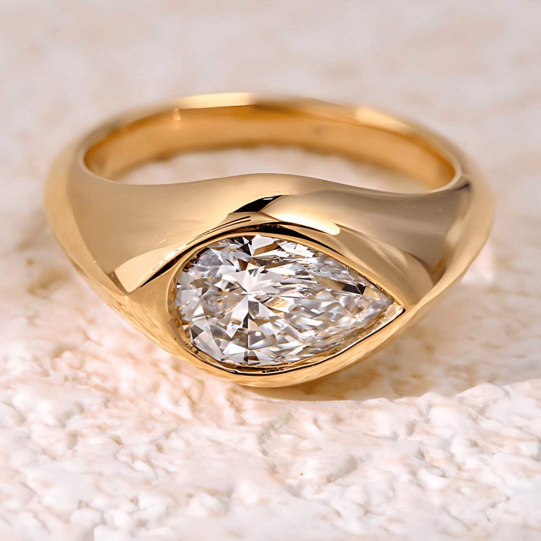 A minimalist pear-shaped lab-grown diamond ring featuring a smooth flowing band and bezel setting. Designed for effortless elegance and everyday wear.