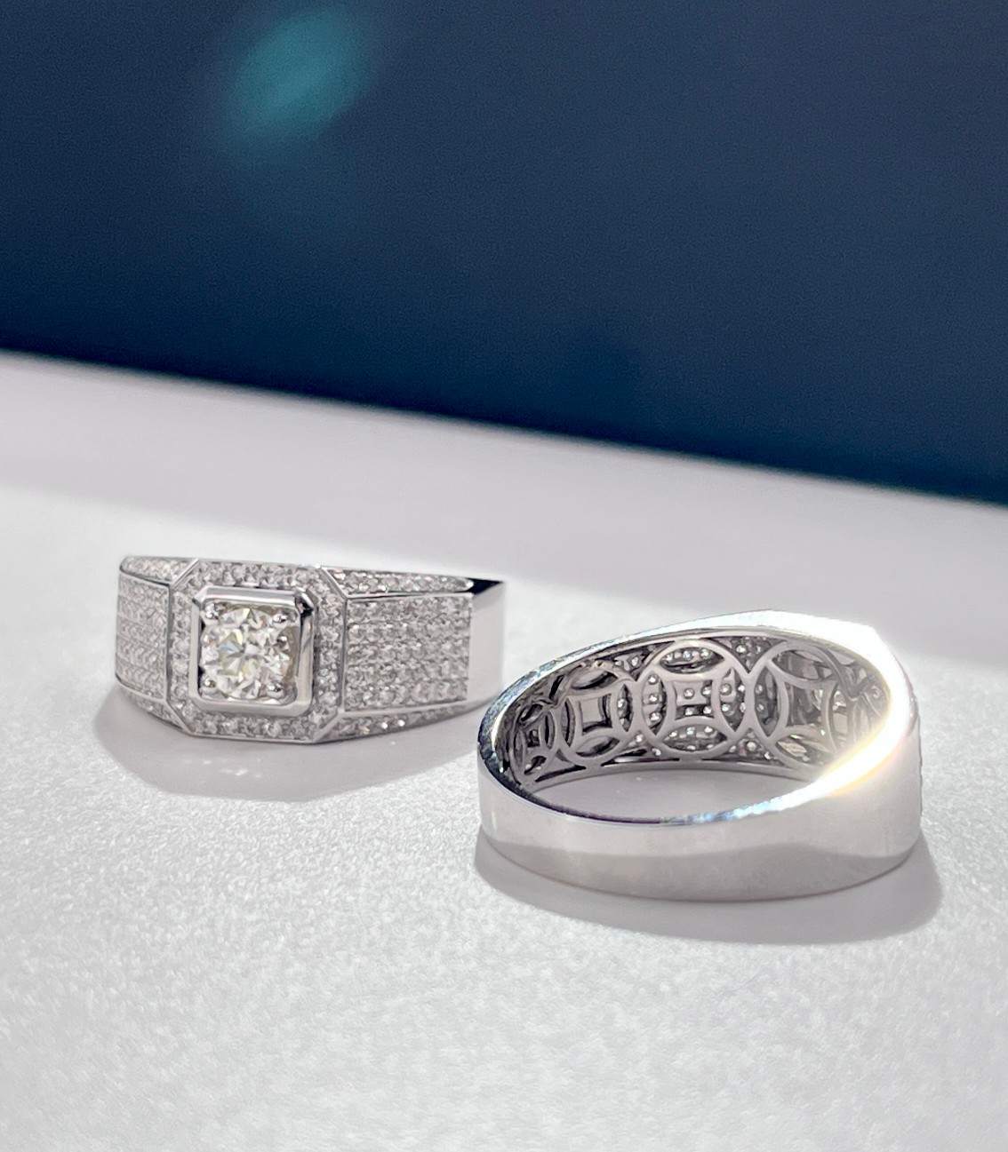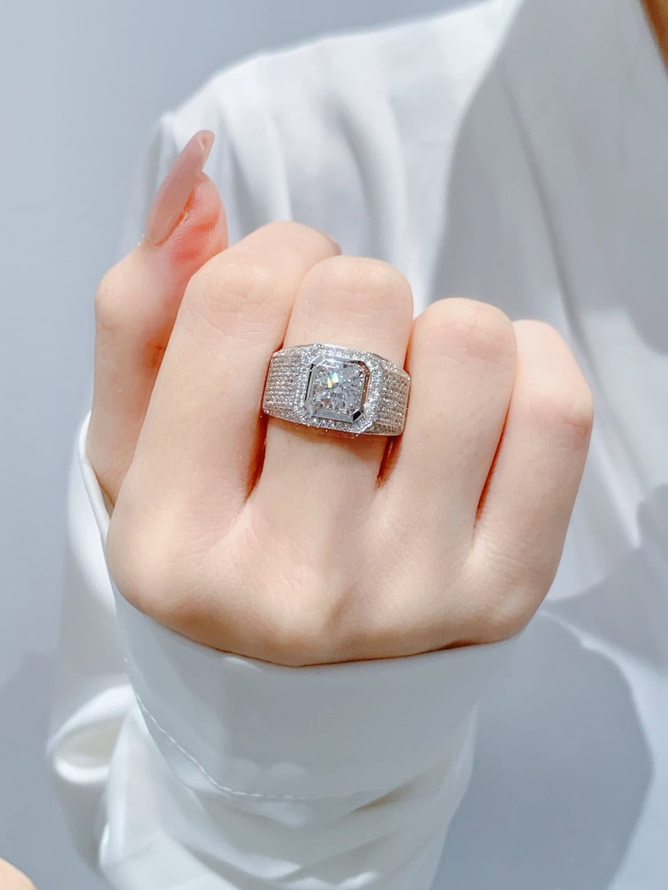 A bold platinum men’s ring featuring a center lab-grown diamond with multi-row pavé detailing. Designed with structure, contrast, and strong visual presence.