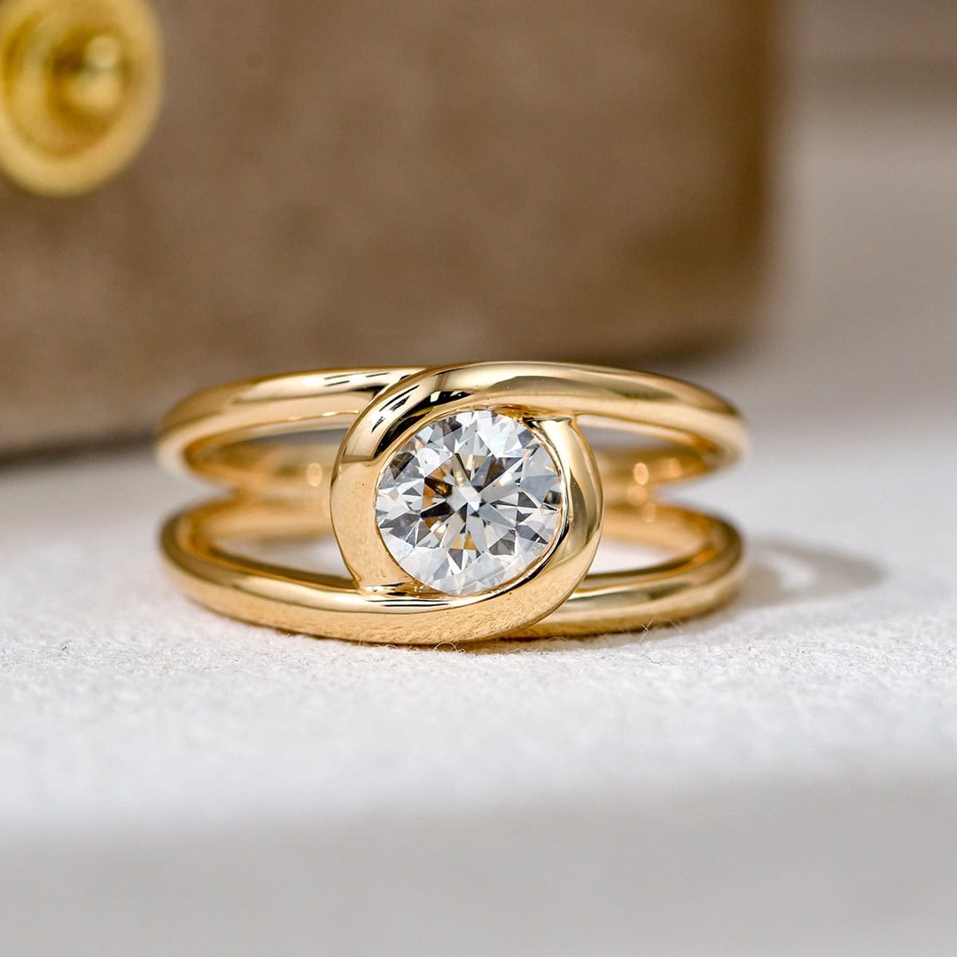 The double-band structure wraps around the center stone in a smooth, flowing motion.
