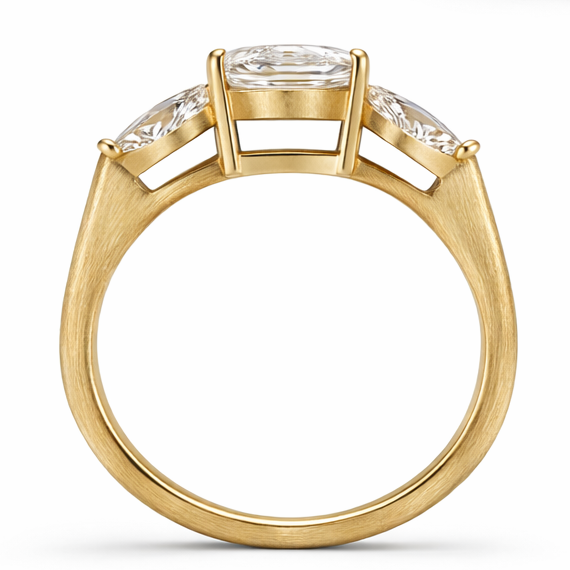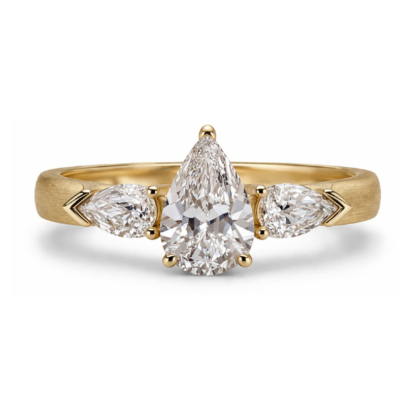 A three-stone ring featuring pear-shaped diamonds and a brushed gold band.