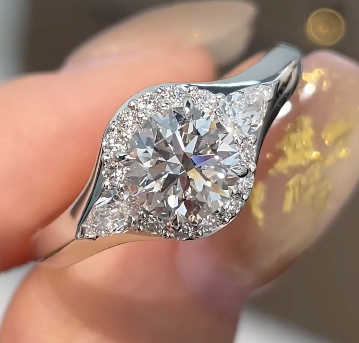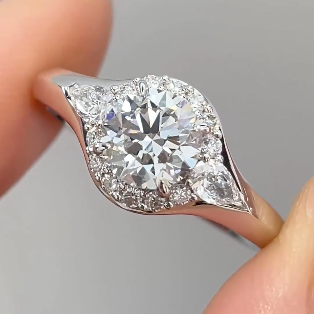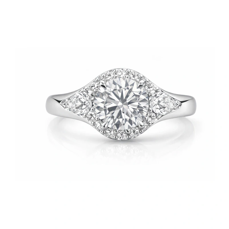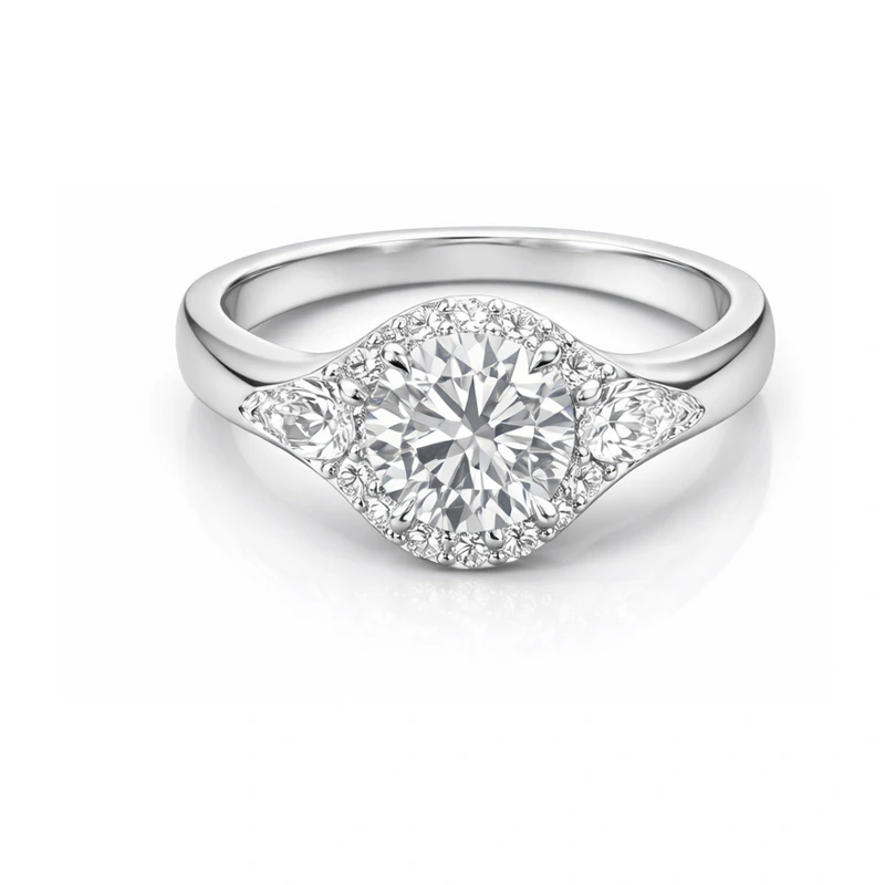 A three-stone diamond ring featuring a round center, marquise side stones, and a pavé halo.