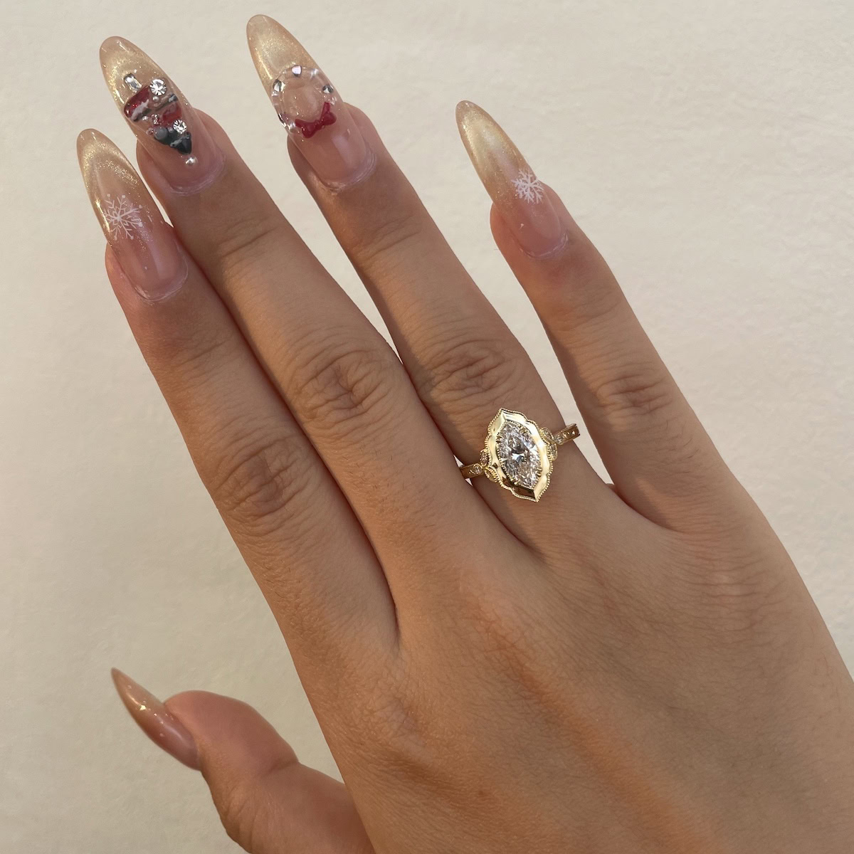 I fell in love with this ring the moment I opened the box. The vintage Victorian style details around the marquise diamond are so delicate and beautiful. It really feels like a piece of antique jewelry but with a bright modern sparkle.